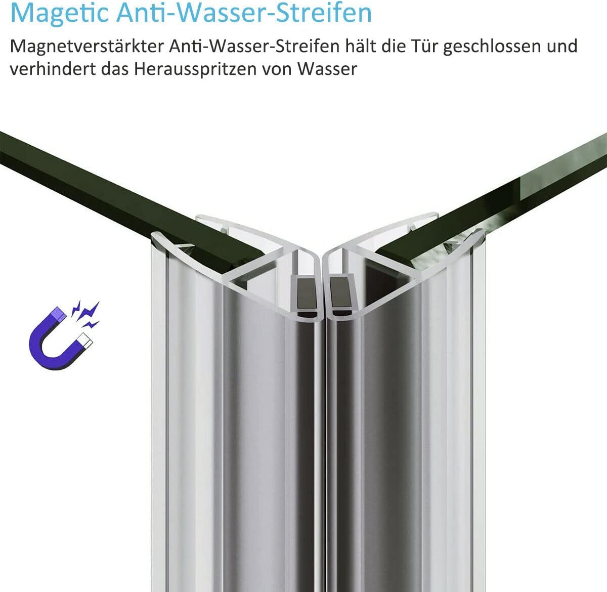 Duschkabine mit elegantem rahmenlosen Design, Die Tür besitzt einen Magnetverschluss sowie eine Gummidichtung unter der Tür, sodass ein dichtes Schließen garantiert ist. Die zusätzlich gelieferte Aluminium Bodenleiste verhindert das ausdringen von Wasser an der Unterkante.